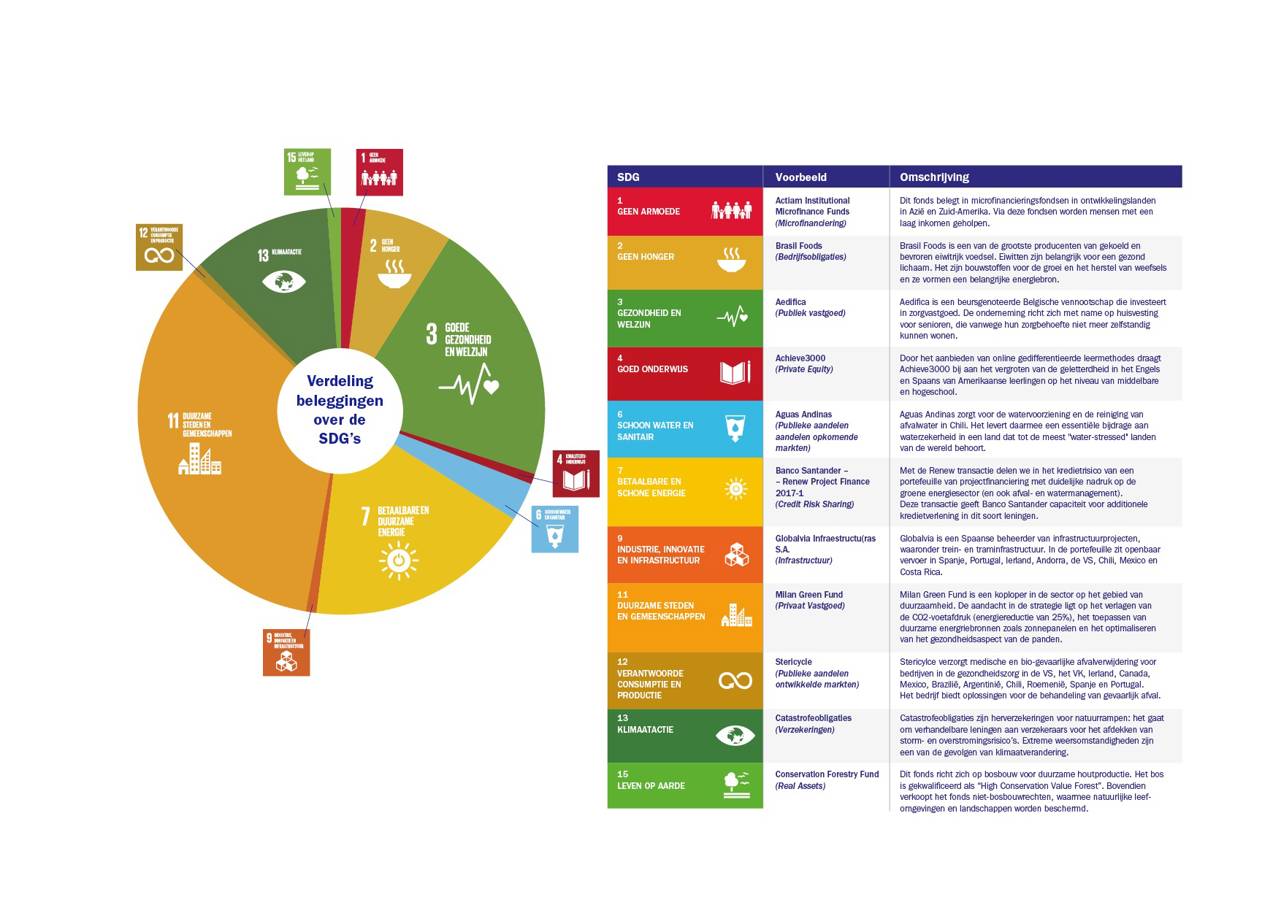 Het meten van positieve tastbare impacts – zoals het aantal kWh hernieuwbare energie gegenereerd, het aantal m3 water bespaard of het aantal levens verlengd – doen we al vier jaar voor onze Beleggingen in Oplossingen (BiO). Dit zijn beleggingen die bijdragen aan vier maatschappelijke thema’s die te vertalen zijn naar 5 van de 17 SDG’s: klimaatverandering (SDG 7) en vervuiling (SDG 12), waterschaarste (SDG 6), voedselzekerheid (SDG 2) en gezondheidszorg (SDG 3).