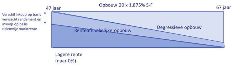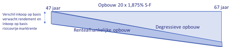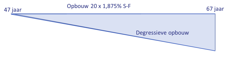 Het verwachte pensioen wordt lager door de overstap van tijdsevenredige opbouw naar degressieve opbouw. Het lichtblauwe vlak illustreert het verlies voor de deelnemer.