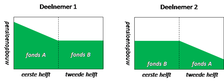 Stel dat beide systemen naast elkaar zouden bestaan. Fonds A heeft een regeling met degressieve opbouw en fonds B heeft een regeling met progressieve premie. Nu beschouwen we twee deelnemers, die – op hun loopbaan na – volstrekt identiek zijn. Zie figuur.