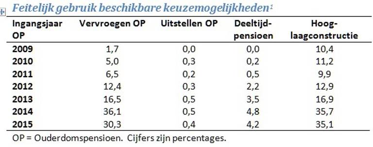 Een veel gebruikte keuze-optie houdt verband met het aflopen en uitfaseren van de VUT- en prepensioenregelingen en het stijgen van de pensioenleeftijd. Deelnemers maken toenemend gebruik van het vervroegen van hun ouderdomspensioen. Deze mensen willen eerder stoppen met werken en vinden langer doorwerken zwaar. Het eerder laten ingaan van hun pensioen maakt deze stap mogelijk. Deelnemers die hun pensioen eerder laten ingaan combineren dat vaak met het overbruggen van een AOW-gat door een aanvullend pensioeninkomen tot het bereiken van hun AOW-leeftijd.