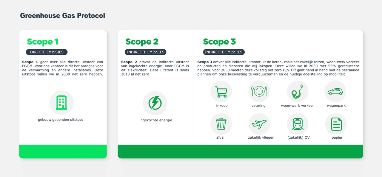 Wat betreft onze CO2-voetafdruk volgen we de Greenhouse Gas Protocol-standaard, die de voetafdruk opsplitst in drie emissiescopes. In de tabel hieronder vind je onze CO2-voetafdruk over 2023 naar de drie emissiescopes. Scope 1 bestaat uit onze directe uitstoot, zoals het aardgas voor de verwarming en andere klimaatsystemen in ons pand. De scope 1-emissies zijn met 49% gedaald ten opzichte van 2019. Scope 2 omvat de indirecte uitstoot van ingekochte energie voor ons gebouw. Door de inkoop van groene stroom zijn onze scope 2-emissies al sinds 2013 net zero.