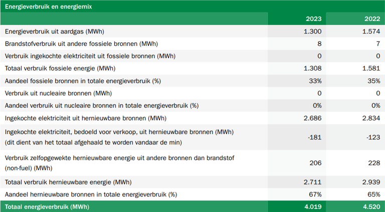 Als onderdeel van onze net zero-ambitie werken we aan het verlagen van ons aardgasverbruik om onze huisvesting aardgasvrij te maken. We wekken deels zelf elektriciteit op met behulp van zonnepanelen en kopen daarnaast 100% hernieuwbare Europese elektriciteit in. In 2023 hebben we ons kantoor voorzien van LED-verlichting en delen van het gebouw gesloten door de fysieke werkomgeving af te stemmen op de hybride aanwezigheid. Dit vermindert ons elektriciteits- en aardgasverbruik.