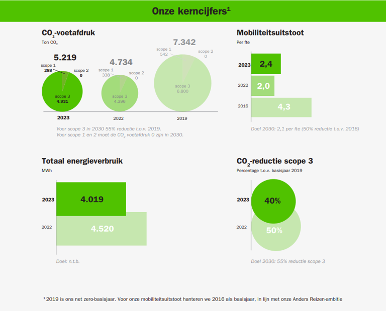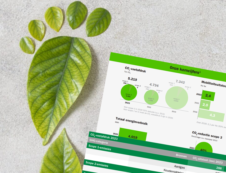 We werken al geruime tijd aan de CO2-reductie van onze bedrijfsvoering. In 2023 zijn we gestart met een gerichtere sturing door de uitwerking van een transitieplan om tot net zero te komen. In dit plan werken we zogenaamde klimaatroutekaarten uit. De klimaatroutekaarten beschrijven voor elk onderdeel waar we CO2-uitstoot genereren (mobiliteit, gebouw, IT, business en overig) en welke stappen we gaan nemen om de uitstoot tot net zero te verminderen. De klimaatroutekaarten ronden we in 2024 af, waarna we overgaan tot implementatie. Dit stelt ons in staat om verdere reducties te realiseren dan we de afgelopen jaren al hebben behaald.
