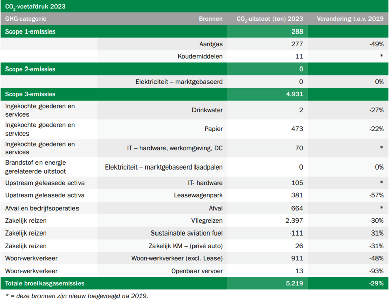 De gemeten scope 3-CO2-uitstoot bedraagt 4.931 ton CO2 in 2023. De scope 3-CO2-uitstoot omvat onder andere de uitstoot van zakelijk reizen, woon-werkverkeer en de producten en diensten die we inkopen. Zoals eerder aangegeven, vormen de beleggingen geen onderdeel van onze scopes. We kunnen de scope-3-CO2-uitstoot steeds beter benaderen. We weten wat onze materiële bronnen zijn en de bronnen die we goed kunnen meten, nemen we mee. Sinds 2022 zijn dit bijvoorbeeld afval en verschillende onderdelen van IT. Bronnen waarvan de meting nog te onzeker is, kunnen we steeds beter benaderen. Deze nemen we mee zodra we hier voldoende zekerheid bij hebben. De scope 3-emissie, gemeten voor dezelfde bronnen als in 2019, is 4.092 ton CO2. Hiermee wordt onze ambitie gerealiseerd.