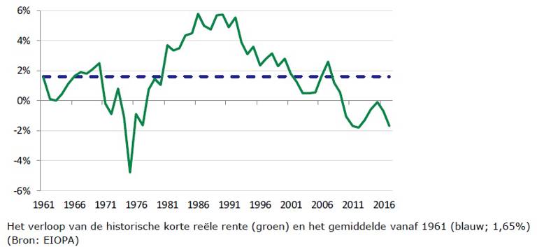 EIOPA berekent het niveau van de UFR als een optelling van (1) de historisch gemiddelde korte reële rente1 en (2) de inflatieverwachting. Bij het bepalen van de historisch gemiddelde korte reële rente wordt over een zeer lang interval gerekend, namelijk vanaf 1961 tot en met nu. De figuur laat zien dat dit gemiddelde momenteel gelijk is aan 1,65%.