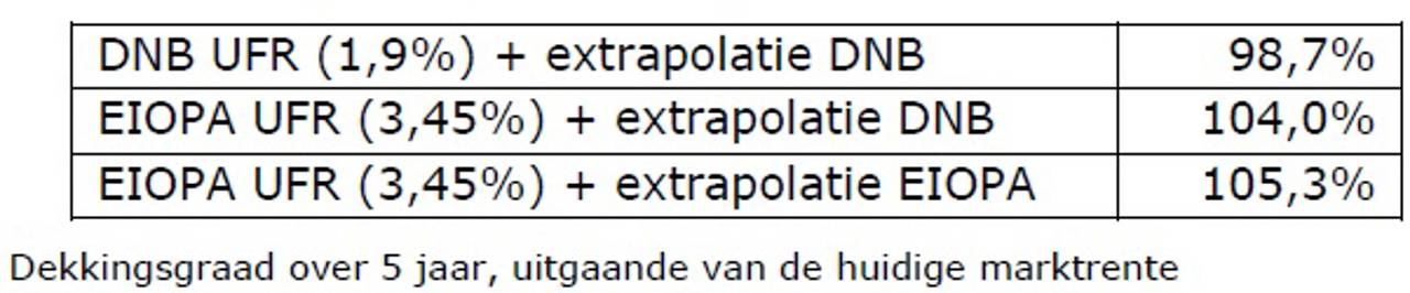 Als vervolgens het niveau van de UFR wordt aangepast naar dat van EIOPA, dan stijgt de dekkingsgraad met 5,3%-punt. Als ook de extrapolatiemethode van EIOPA wordt gehanteerd, dan stijgt de dekkingsgraad nog eens 1,3%-punt extra. Per saldo leidt de overstap op de EIOPA UFR dus tot een dekkingsgraadstijging van 6,6.
