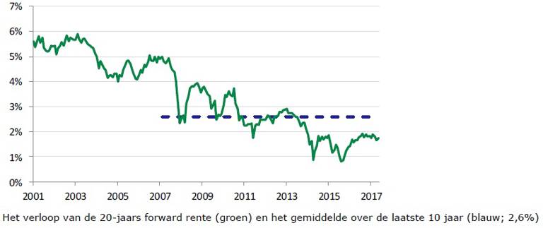 DNB stelt het niveau van de UFR gelijk aan het historisch gemiddelde van de 20-jaars forward rente, gemeten over de voorafgaande 10 jaar. De figuur laat zien dat de UFR volgens deze DNB systematiek eind 2017 op een waarde van 2,6% ligt.