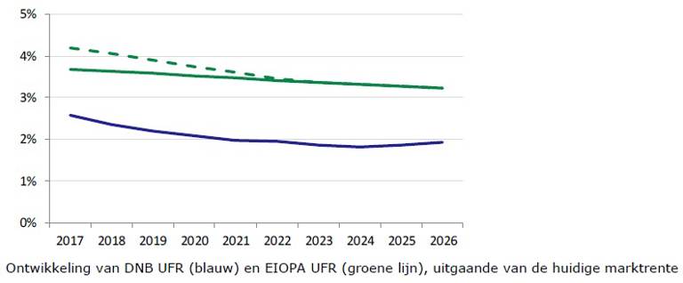 De huidige EIOPA UFR is echter hoger dan deze 3,65%. Dat komt omdat EIOPA voor zijn UFR een maximale jaar-op-jaar afwijking van 0,15% hanteert. Aangezien het niveau van de UFR in 2017 nog 4,2% was, is deze in 2018 en 2019 reeds vastgesteld op 4,05% en 3,9% respectievelijk. Het is zeer aannemelijk dat de EIOPA UFR in 2020 en 2021 nog verder zal dalen tot een niveau van rond de 3,65%.