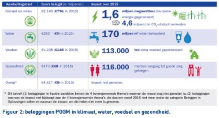 PGGM heeft met bovenstaande aanpak tot op heden circa 10 miljard euro belegd in oplossingen voor klimaat, water, voedsel en gezondheid, zie figuur 2.