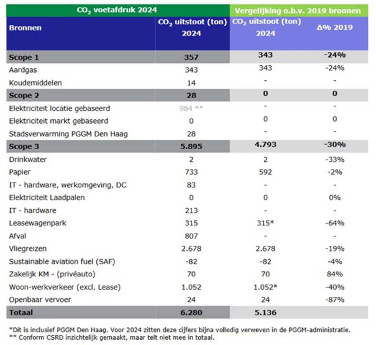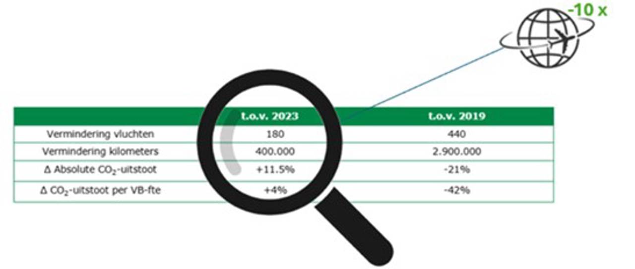 Ondanks een daling van 48% ten opzichte van ons basisjaar 2019 vormt mobiliteit ook in 2024 nog altijd onze grootste uitstootbron. Binnen deze categorie heeft ons zakelijk vliegverkeer, met 2.678 ton CO₂ in 2024, het grootste aandeel.