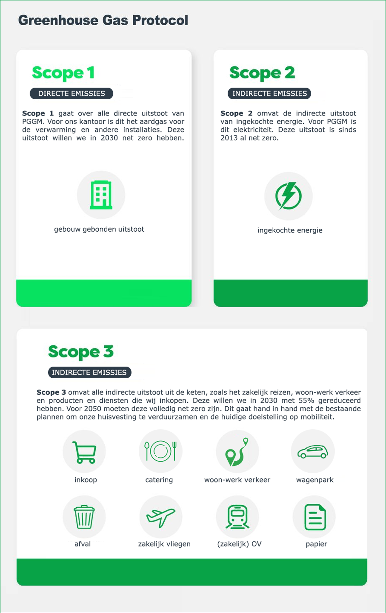 Om onze net zero-doelstelling te bereiken, hebben we voor elke categorie in onze CO₂-voetafdruk tussentijdse doelen opgesteld. Daarbij volgen we het internationale Greenhouse Gas Protocol (GHG-protocol), dat onderscheid maakt tussen drie scopes: