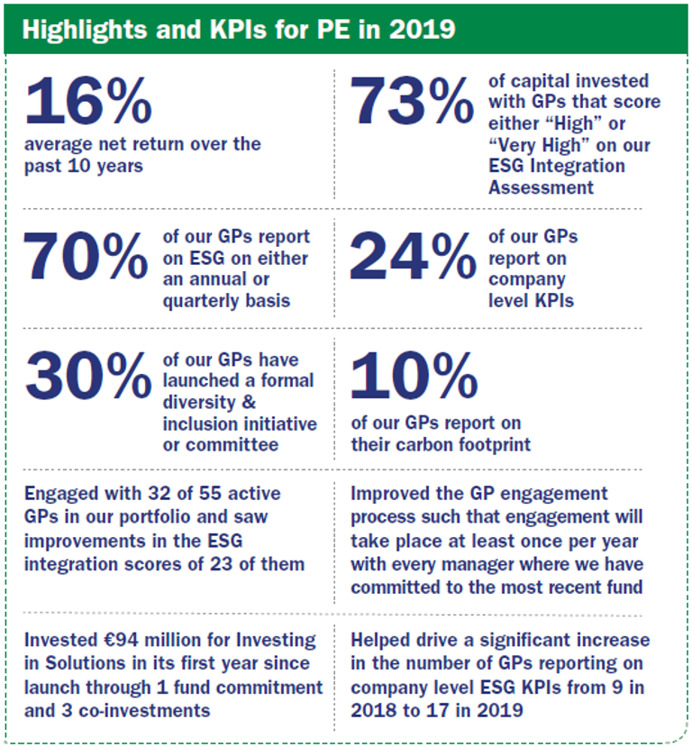 In 2019 hebben we ESG engagement met GP’s (externe managers) zodanig verbeterd dat we nu minimaal één keer per jaar contact hebben met elke manager bij wie we hebben gecommiteerd aan hun meest recente fonds (dit noemen we ‘doorlopende’ managers). Tot 2019 identificeerden we op basis van een risicobeoordeling een selecte groep externe managers waar we ons op concentreerden. We willen echter verbeteringen stimuleren bij al onze managers en daarbij is regelmatig engagement belangrijk. We spreiden de engagementactiviteiten nu beter door het jaar en dit maakt het proces efficiënter.