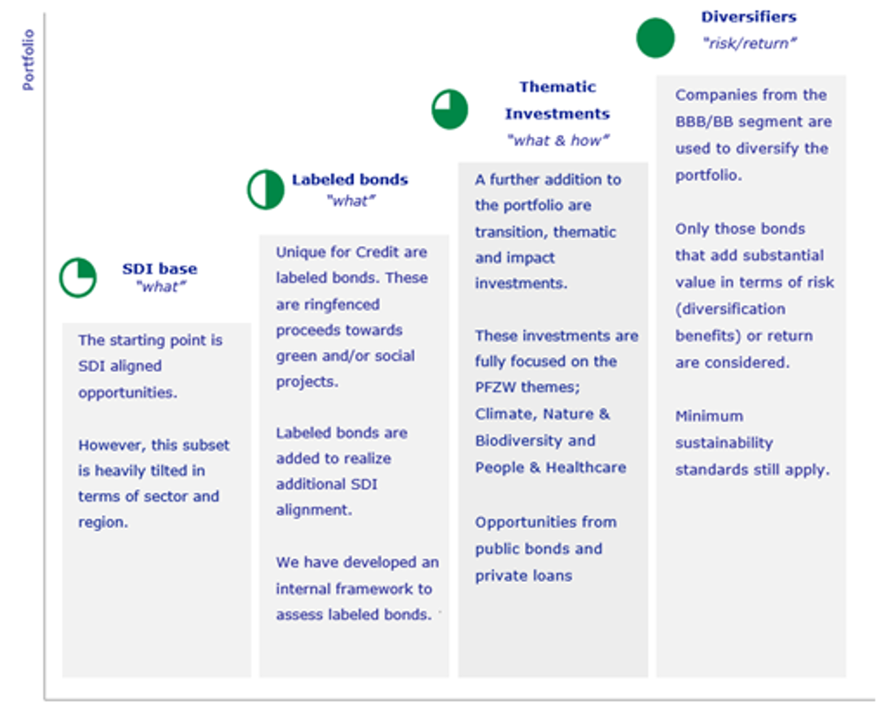 In 2023, we started developing a credit portfolio for PFZW in which sustainability is given equal weight alongside return and risk. This resulted in a prototype based on a clearly defined investment philosophy. Today, this prototype forms the blueprint for our global approach of credit investing as part of PFZW’s new credit mandate.