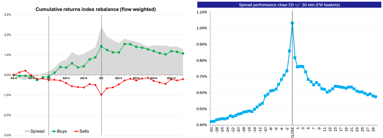 Right: Intraday spread performance 30 minutes before and after close. Source: PGGM Systematic Equity Strategies