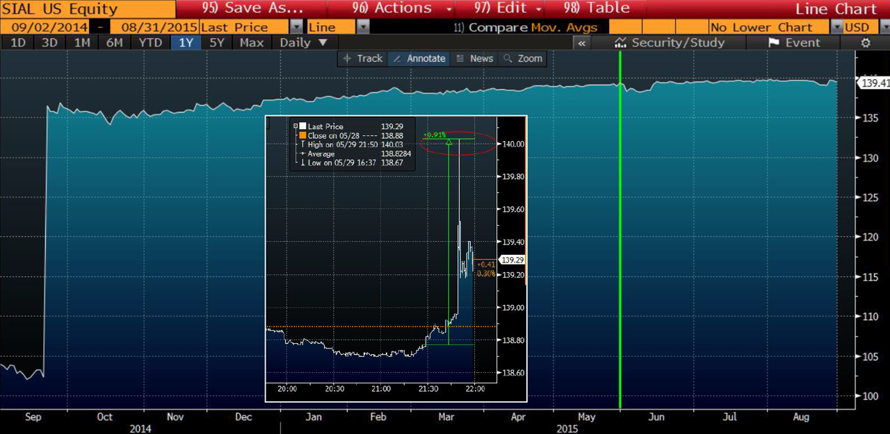 Just minutes before the market close on May 29th, Sigma-Aldrich’s stock price quickly rose from 139.00 to and above 140.00 due to MSCI investors which were very anxious to get hold of the stock and even more so to not miss their benchmark entry point. The stock ended up trading up a high of 140.03 USD a share, indicating that some investors settled for a sure loss as they will never receive more than the takeover bid of 140.00.
