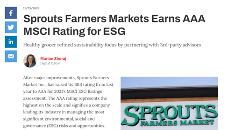 When we first invested in Sprouts in 2016, it was a relatively unknown company, far away from the radar of most sustainability focused investors. It also attracted little interest from various sustainability rating agencies and those that did notice Sprouts, tended to rate it poorly. No wonder, Sprouts was a relatively new and small company and its sustainability policies and disclosures were still in its infancy, far behind some of its larger peers in US food retail sector.