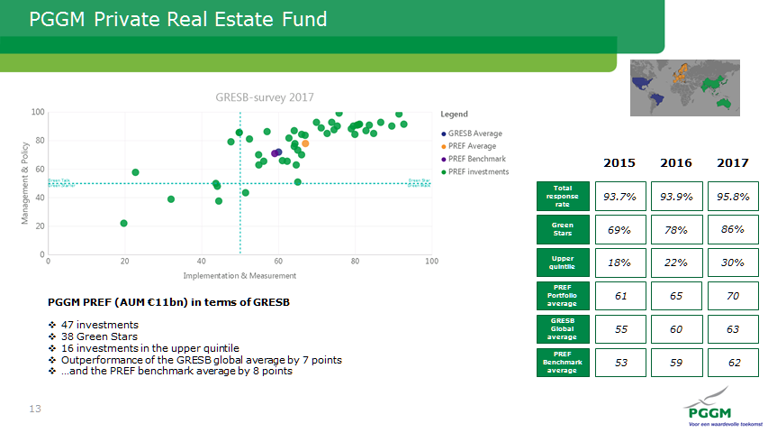 The ambition to develop GRESB into a global standard has been achieved. Now, in 2017, almost nine hundred real estate funds worldwide participate, mainly in Europe, but also more and more in North America and Asia – representing a collective property value of 2800 billion dollars. With the scores that GRESB gives to real estate managers, PGGM gains insight into the way in which these managers implement sustainability in the real estate portfolios of PGGM’s clients.