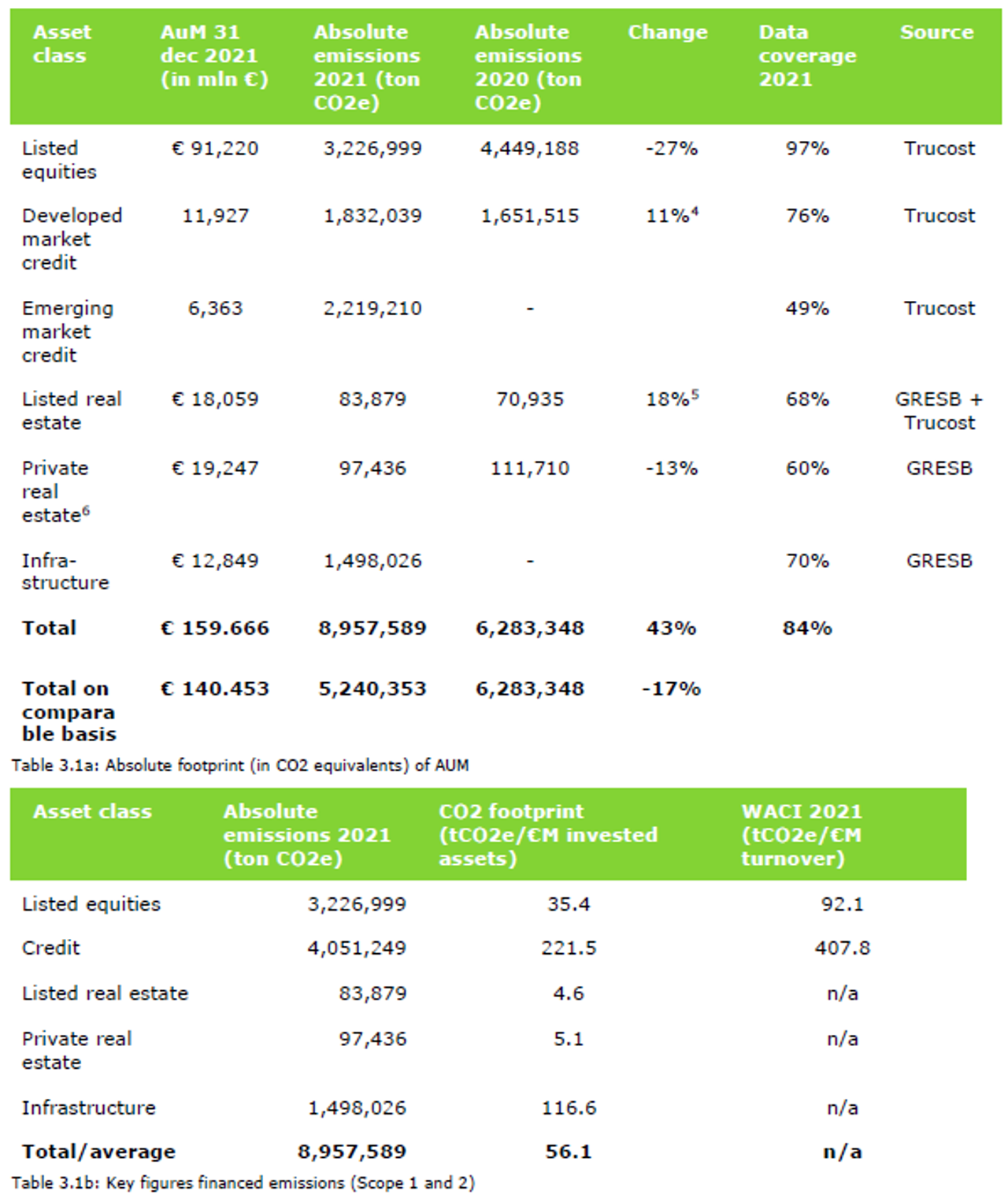 PGGM Investments also reports itself, in line with the Dutch climate accord, on the absolute footprint (in CO2 equivalents) of the total investments under our management (see table 3.1). We aim to inspire market participants to do the same, especially companies we invest in on behalf of our clients. Such measurements are important in monitoring and constructing our portfolio. By identifying greener companies and sectors, we can (re)direct funding and limit the exposure to transition risks with regards to climate change. In addition, this data is of importance in our engagement activities with companies we have invested in. The climate objectives of organizations usually relate to the emissions of greenhouse gases. By using CO2 footprints, we can use our influence as a major investor in the monitoring our portfolio to put energy efficiency and climate action on top of their agendas.