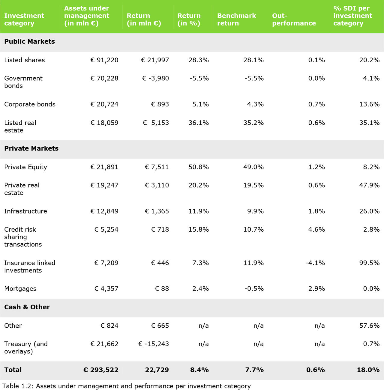 Table 1.2 shows the assets under management and performance per investment category. Also, the contribution to the SDG’s is presented per asset class. Read more about this in chapter 2.1 How our clients’ investments contribute to the SDG’s.