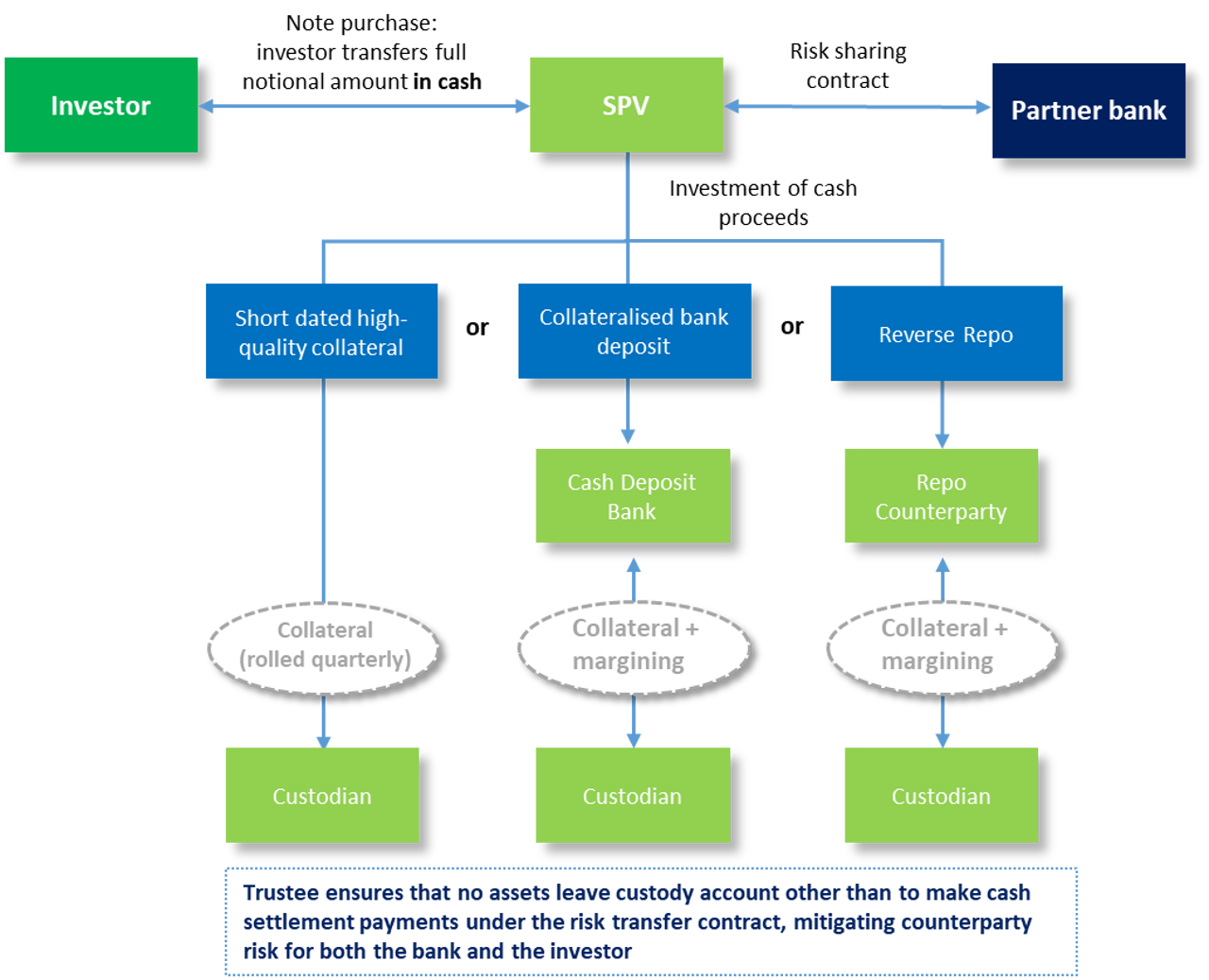 In our transactions we always ensure that the full notional of our transactions is invested such that we are not exposed to unsecured credit risk of the risk sharing bank. At the same time, there is always certainty of funds available to the bank when a valid credit event claim needs to be paid. To achieve this, we have adopted quite straightforward structures: either the bank collateralises the investment notional by providing high-quality collateral (via a collateralised bank deposit or a reverse repo) or the investment notional is directly invested in high-quality short-dated collateral. These ways of collateralisation have been accepted by all our counterparties for many years. Another alternative could be to invest the investment notional in a money market fund, a structure that has become commonplace in, for example, the cat bond market since the default of Lehman. In any of these cases, the transaction is structured such that collateral cannot leave the transaction and can only be used to fulfil any cash settlement payment obligations under the risk sharing contract as they arise. This ensures that neither the investor nor the bank runs counterparty credit risk vis-à-vis each other. For the avoidance of doubt: the investor bears the risk and return of the underlying collateral.
