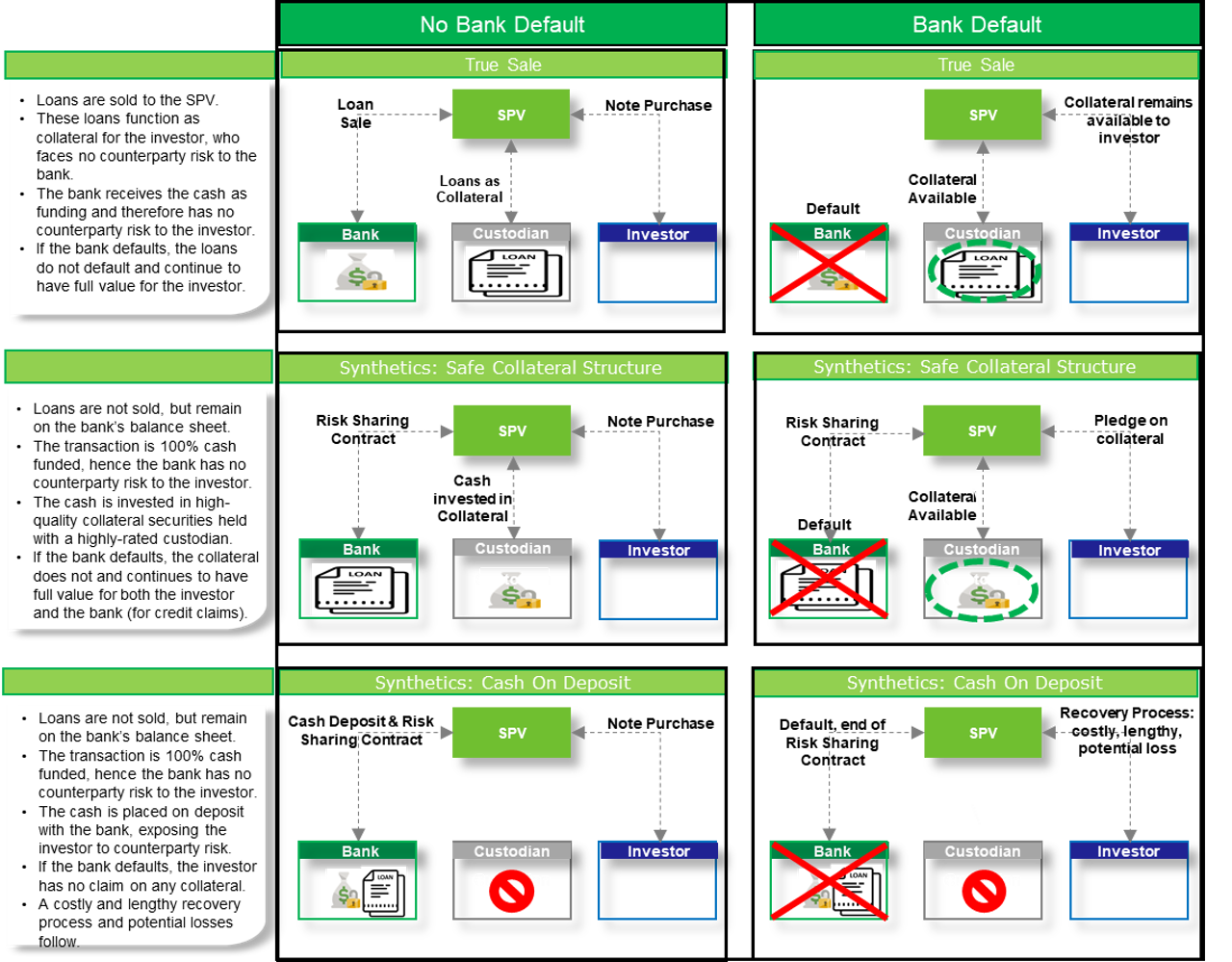 The below graphic clarifies this point by comparing the situation before and after a bank insolvency for 1) a true sale securitisation, 2) a funded and collateralised synthetic securitisation, and 3) a synthetic securitisation where the funding is put on deposit with the bank. It highlights that a synthetic securitisation can achieve an equal level of protection for bank and investor in terms of counterparty risk compared to a true sale securitisation, but only if the transaction is funded by the investor with cash and if that funding is collateralised, thereby remaining fully separated from the default risk of the bank.