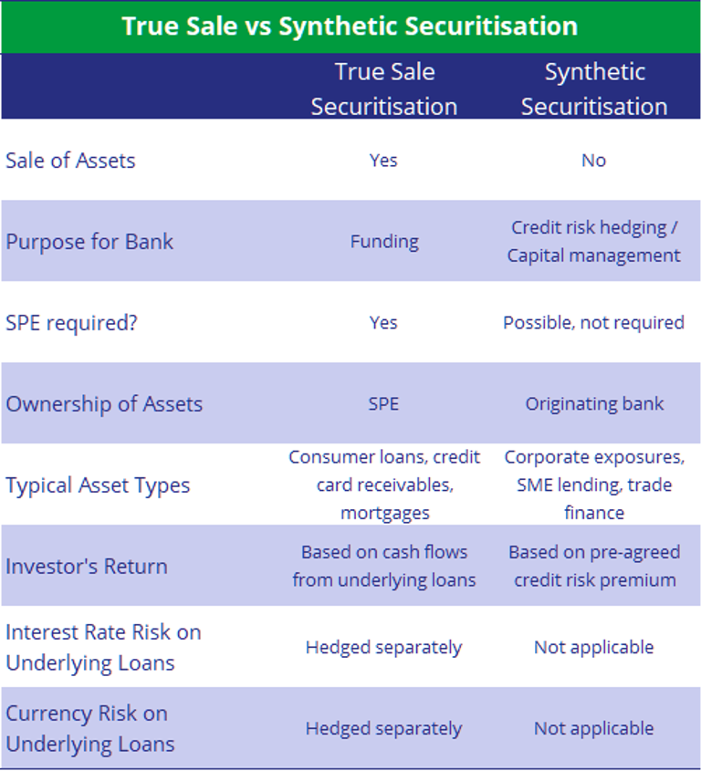 The term ‘synthetic’ comes from the fact that, unlike in a true sale or ‘traditional’ securitisation, the securitised loans being securitised are not sold by the bank but are referenced.