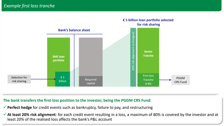 The figure below shows the typical outline of a credit risk sharing transaction. Together with the bank, we agree on a selection of loans from a particular lending book on the bank’s balance sheet that is eligible for the risk sharing portfolio. In the figure below an example is displayed for an SME lending book of a bank (left side of the figure). Of this loan portfolio (in the example a € 5 billion selected loan portfolio), we typically invest in the first loss tranche and the bank retains the senior tranche. This is illustrated in the right hand side of the figure. In addition, we ensure there is a strong alignment of interest. We structure this by requiring the bank to continue to hold at least 20% of the total exposure to the credit risks covered by the credit risk sharing. In other words, the bank can only hedge up to 80% of its total exposure to its client. This way, both parties are aligned when any loan in the transaction faces potential payment failure.