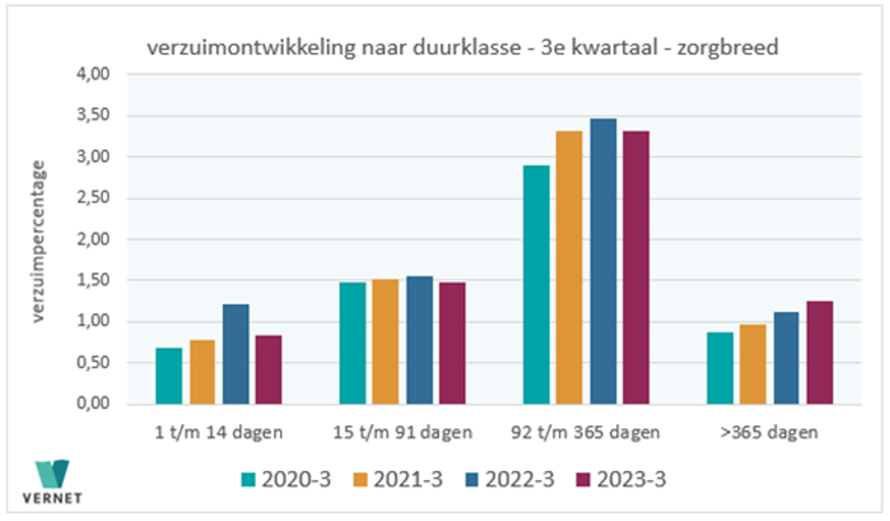 Dit blijkt uit nieuwe cijfers van onderzoeksbureau Vernet. In vergelijking met het verzuimpercentage over het derde kwartaal van 2022 (7,37) is het verzuim met 6,4 procent gedaald naar 6,9 in 2023. In het eerste kwartaal was er sprake van een daling van maar liefst 11 procent, gevolgd door een daling van ruim 7 procent in het tweede kwartaal. Zie bijlage 1