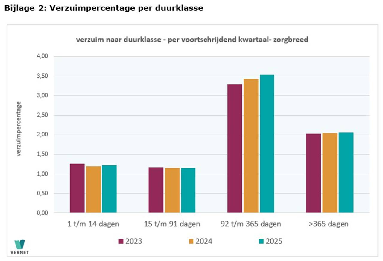 De stijging in 2025 wordt volledig verklaard door het langdurig verzuim. In de duurklasse 92 tot en met 365 dagen is het verzuim verder toegenomen. Deze categorie heeft het grootste aandeel in het totale verzuim en is nog nooit zo hoog geweest. Ook het extra langdurig verzuim (366 tot en met 730 dagen) blijft stijgen (zie bijlage 2).