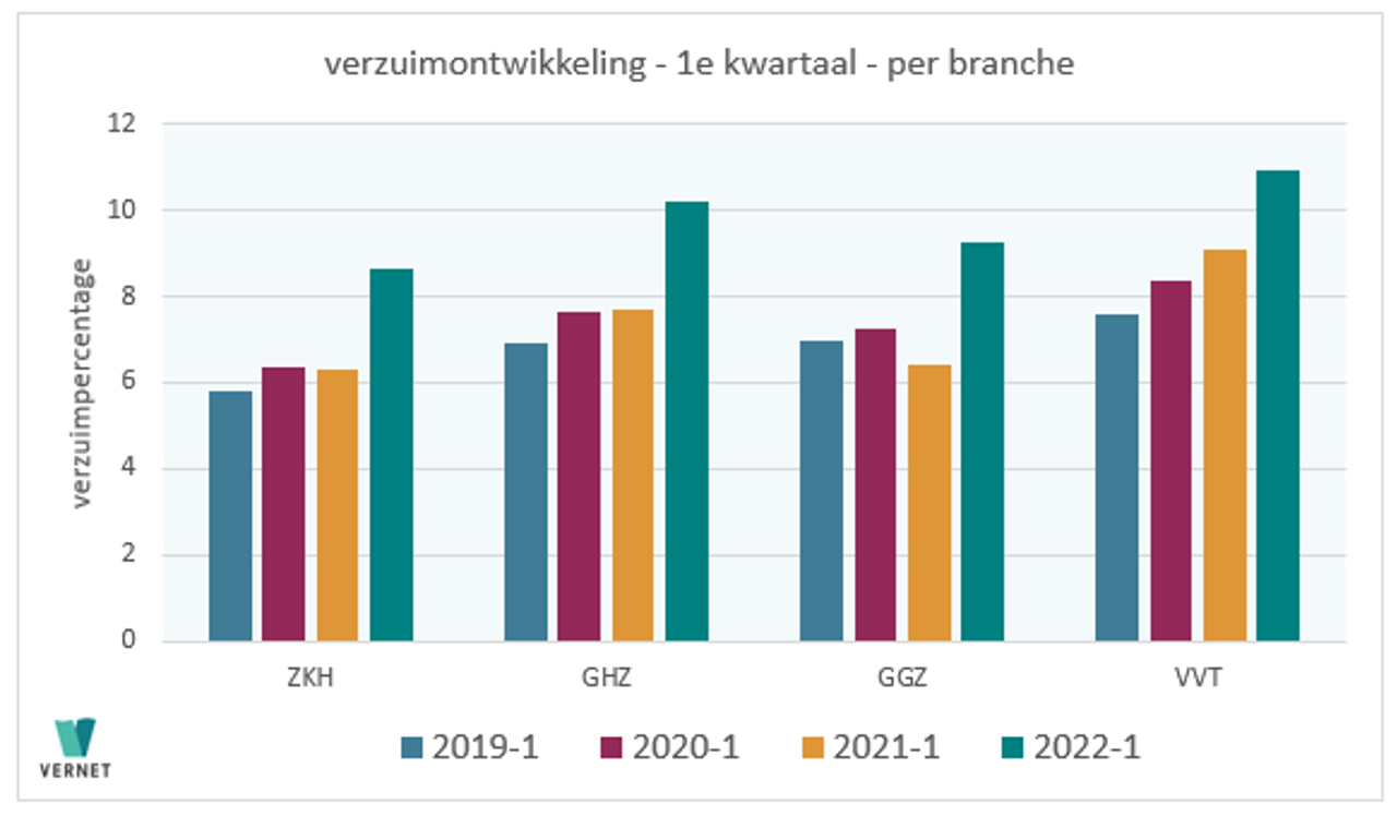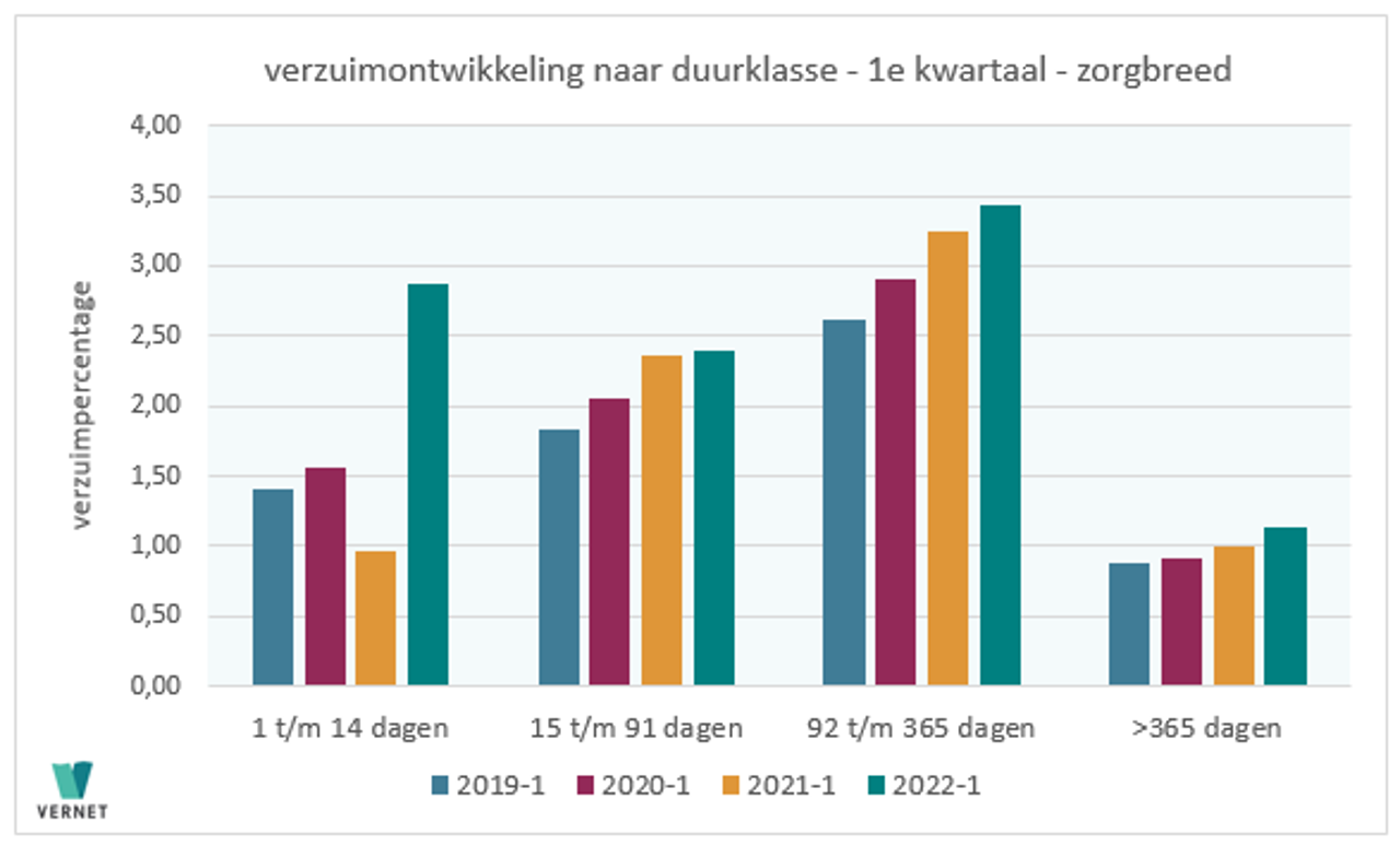 Vernet constateert dat het verzuim in alle vier de duurklassen (kort-middel-lang-extra lang) gestegen is. De stijging in het eerste kwartaal is het grootst in de categorie kort verzuim. Het percentage in de categorie 1 t/m 14 dagen is 2,86 procent. Een jaar geleden was dit nog 0,97 procent, een stijging van bijna 200 procent. Een voor de hand liggende verklaring hiervoor is de Covid-besmettingsgolf met de omikronvariant en de daaropvolgende griepgolf. Opnieuw is ook een stijging te zien in de laatste twee duurklassen met verzuim langer dan 92 dagen. Dit onderschrijft het beeld van de zorgsector, die met veel langdurige ziektegevallen kampt. Zie ook bijlage 2.