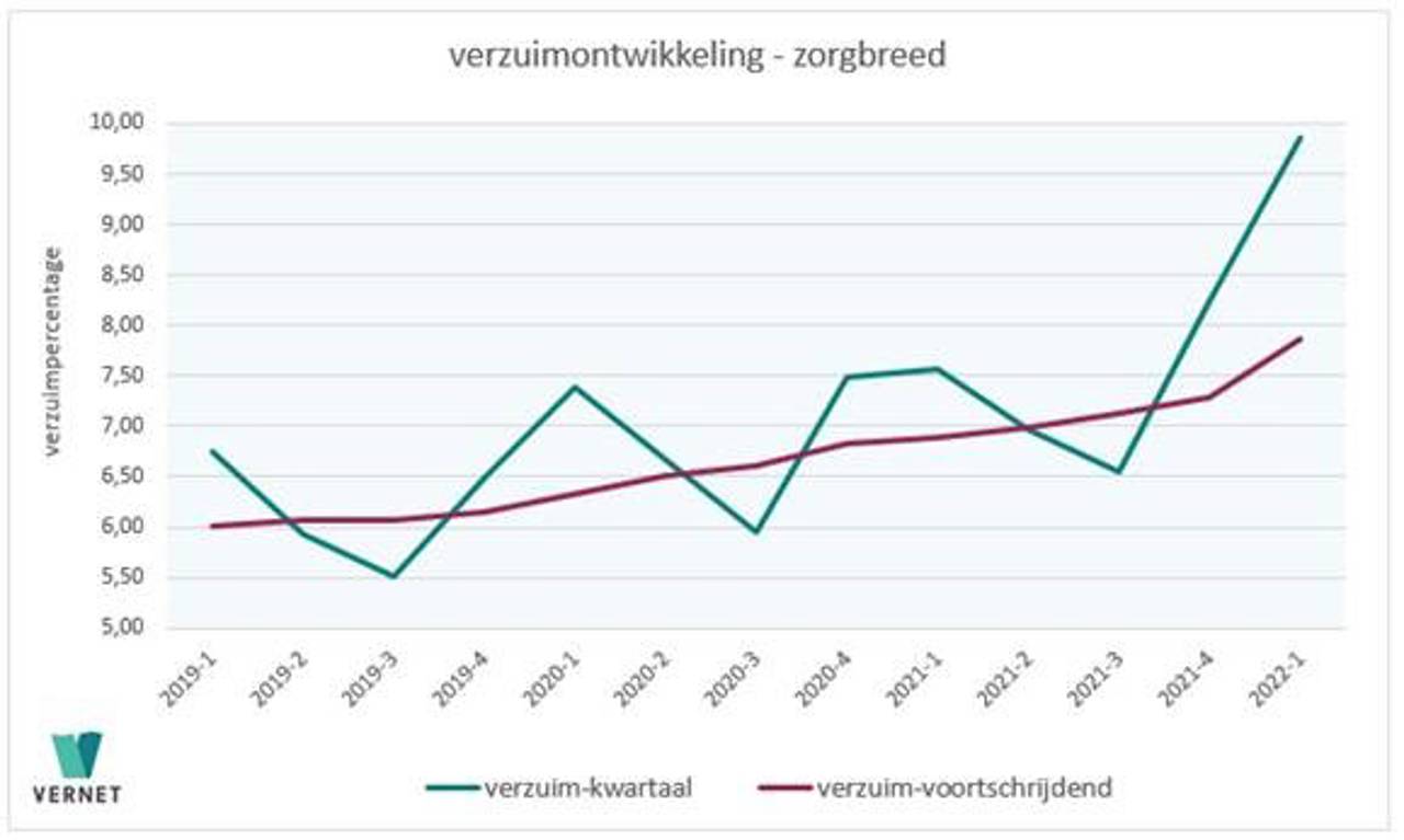 Verzuimdatabedrijf Vernet, dochteronderneming van pensioenuitvoeringsorganisatie PGGM, stelt vast dat het verzuim in de zorgsector in het eerste kwartaal van 2022 is gestegen naar 9,83 procent. In hetzelfde kwartaal vorig jaar was dat 7,56 procent. Dit is een toename van 30 procent in één jaar tijd.