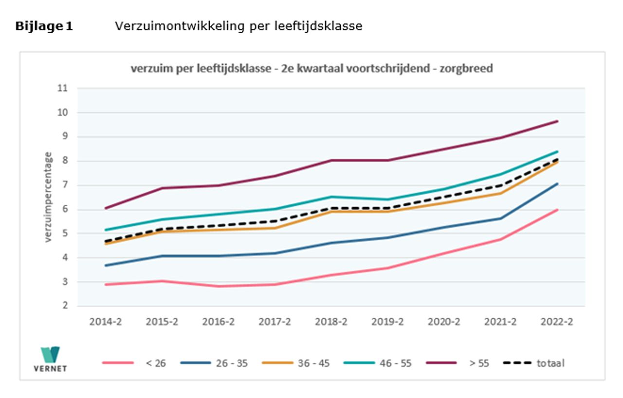Het ziekteverzuim onder jonge werknemers in de zorgsector is in een jaar tijd sterk gestegen. Dit blijkt uit nieuwe cijfers van Vernet gemeten over de periode van het derde kwartaal van 2021 tot en met het tweede kwartaal van 2022.