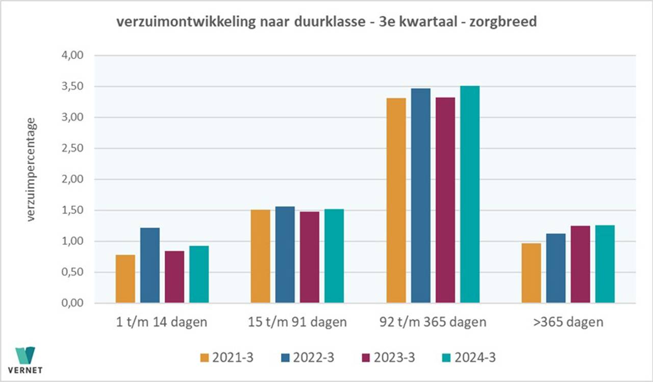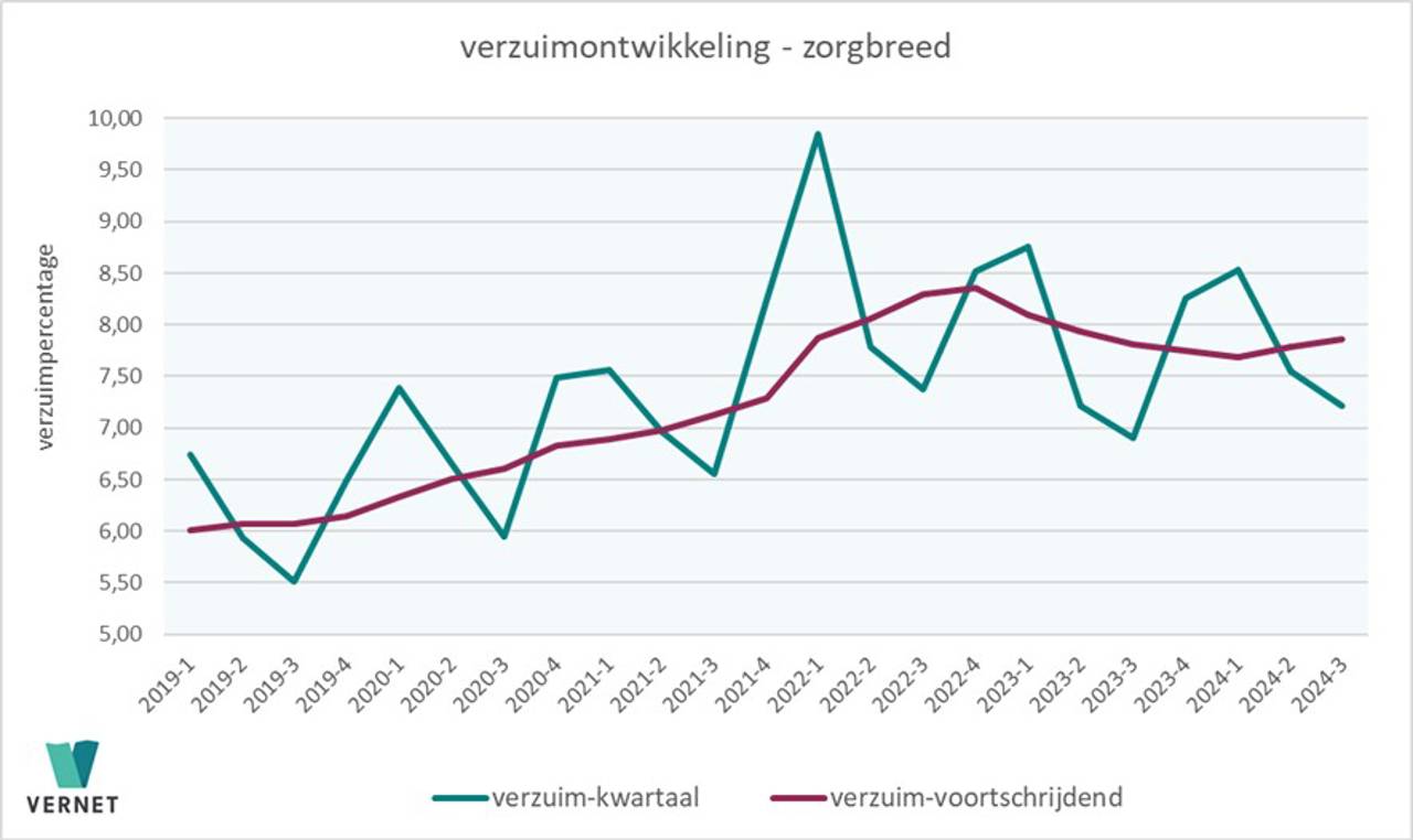 Met een verzuimpercentage van 7,21 in het derde kwartaal van 2024 stijgt het verzuim in de zorgsector met bijna 5% ten opzichte van hetzelfde kwartaal in het voorgaande jaar, waarin het verzuimpercentage 6,9% was (zie bijlage 1). Dit blijkt uit nieuwe cijfers van onderzoeksbureau Vernet.