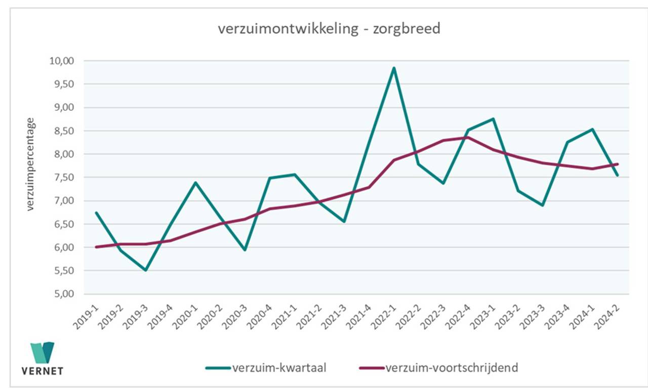 Met een verzuimpercentage van 7,55 in het tweede kwartaal van 2024 stijgt het verzuim in de zorgsector met bijna vijf procent ten opzichte van het voorgaande jaar, waarin het verzuimpercentage 7,22 bedroeg. Het is het hoogst gemeten verzuim in een tweede kwartaal sinds 2022 (7,79).