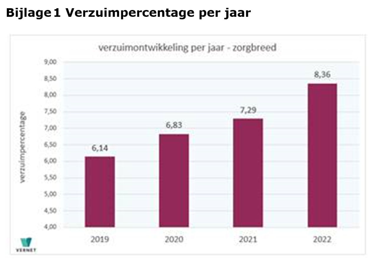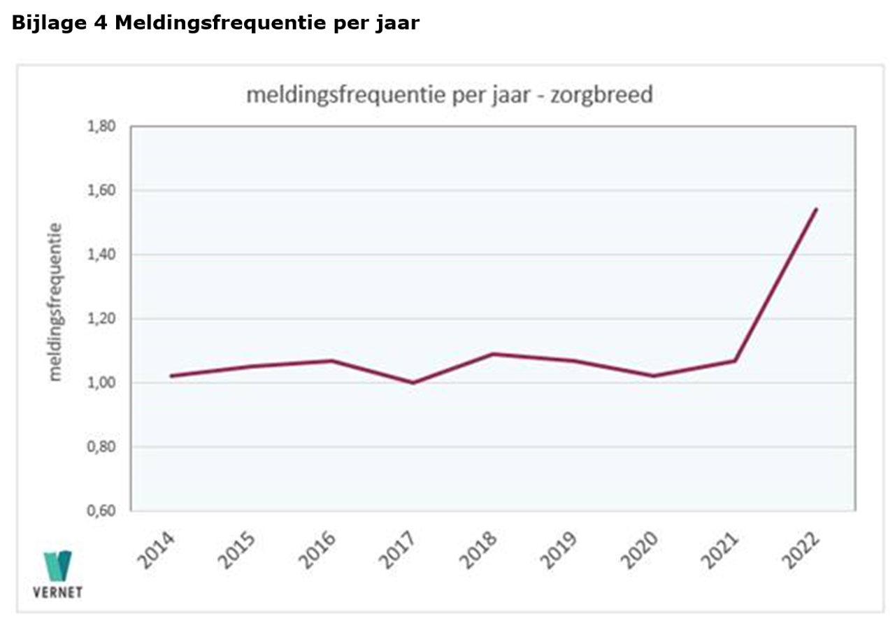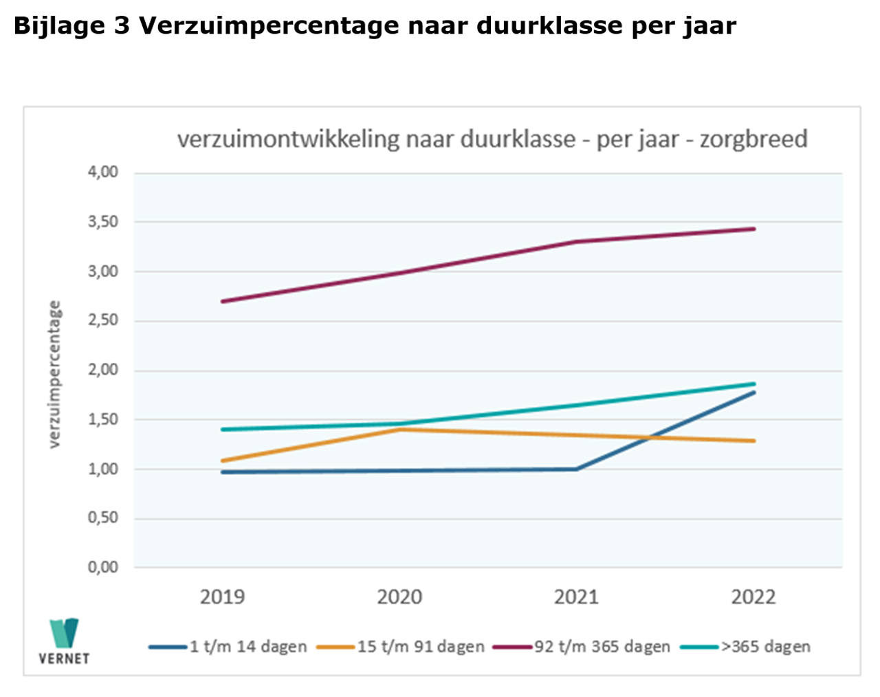 Vernet, dochteronderneming van pensioenuitvoeringsorganisatie PGGM, ziet dat deze stijging vooral werd veroorzaakt door de stijging in kort verzuim. Daarnaast was er sprake van een enorme stijging in meldingsfrequentie die aangeeft hoe vaak werknemers zich gemiddeld ziek meldden. Doorgaans schommelt de voortschrijdende meldingsfrequentie tussen de 1 en 1,1. In 2022 kwam dit uit op 1,54. (zie bijlage 3 en 4)