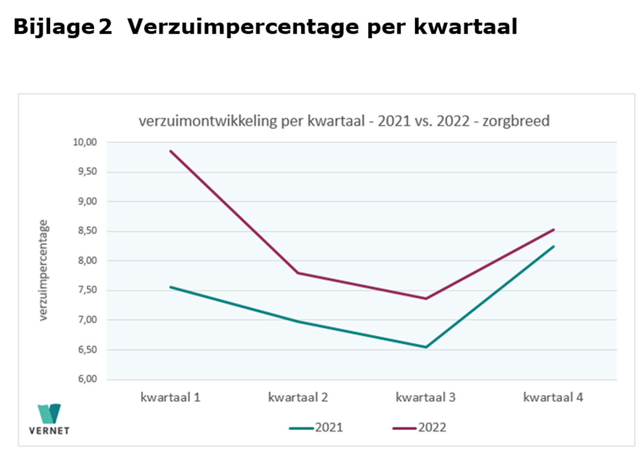 Hoewel er in alle kwartalen van 2022 sprake was van een stijging, valt op dat dit verschil in het eerste kwartaal het grootst was ten opzichte van hetzelfde kwartaal een jaar eerder. Toen steeg het verzuimpercentage van 7,56 naar 9,85. In het laatste kwartaal steeg het verzuimpercentage van 8,24 naar 8,52. Zie bijlage 1 en 2
