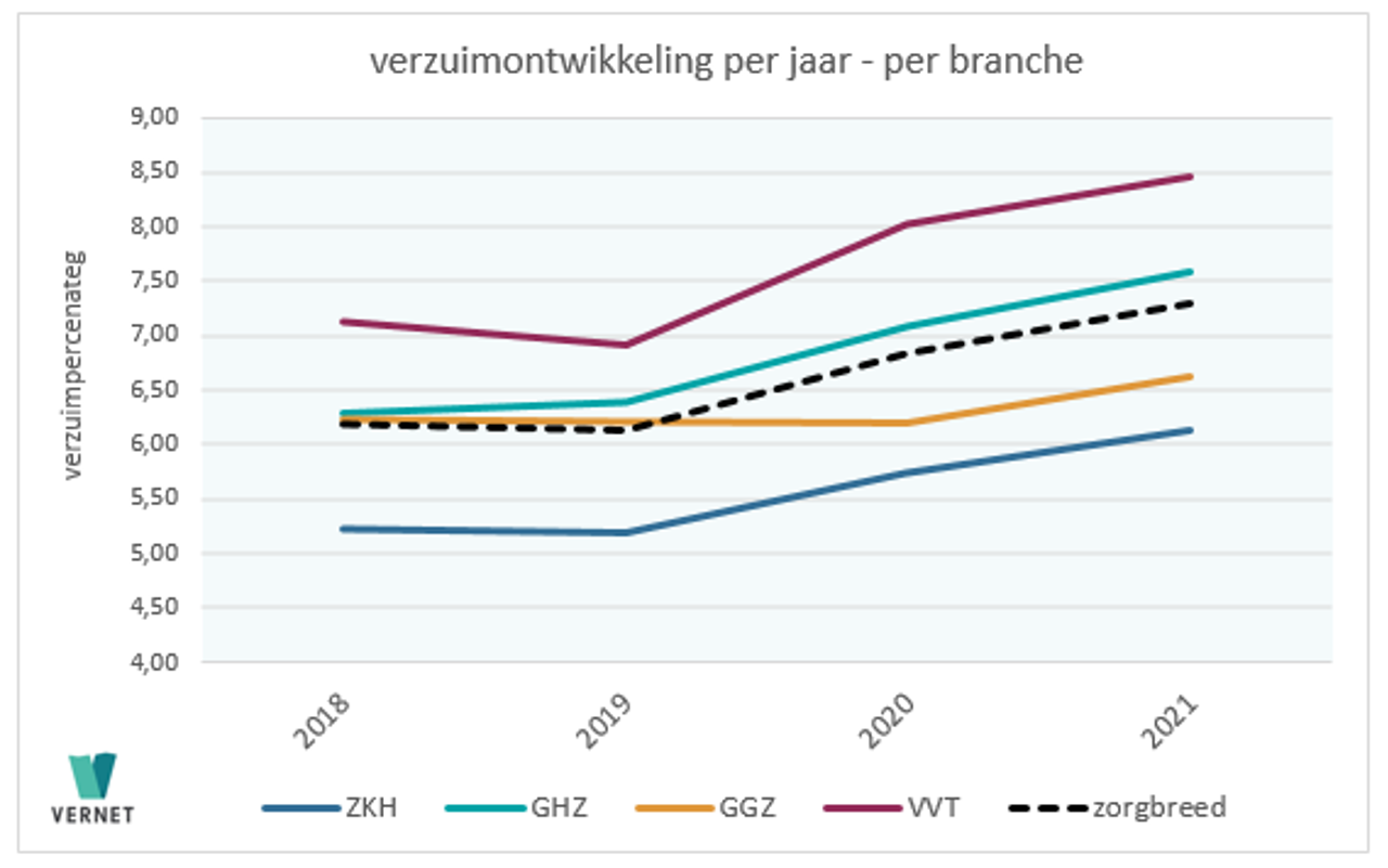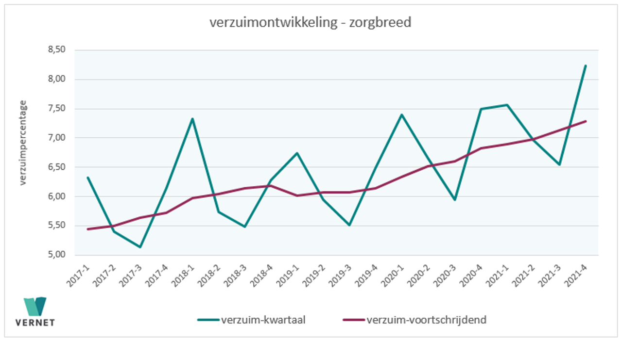 Verzuimdatabedrijf Vernet, dochteronderneming van pensioenuitvoeringsorganisatie PGGM, stelt vast dat het verzuim in de zorgsector in het vierde kwartaal van 2021 is gestegen naar 8,24 procent. In hetzelfde kwartaal vorig jaar was dat 7,49 procent. Dit is een toename van 10 procent in één jaar tijd, waarmee het op het hoogste niveau in twee decennia is beland. Met name het langdurig verzuim is afgelopen jaar sterk toegenomen.