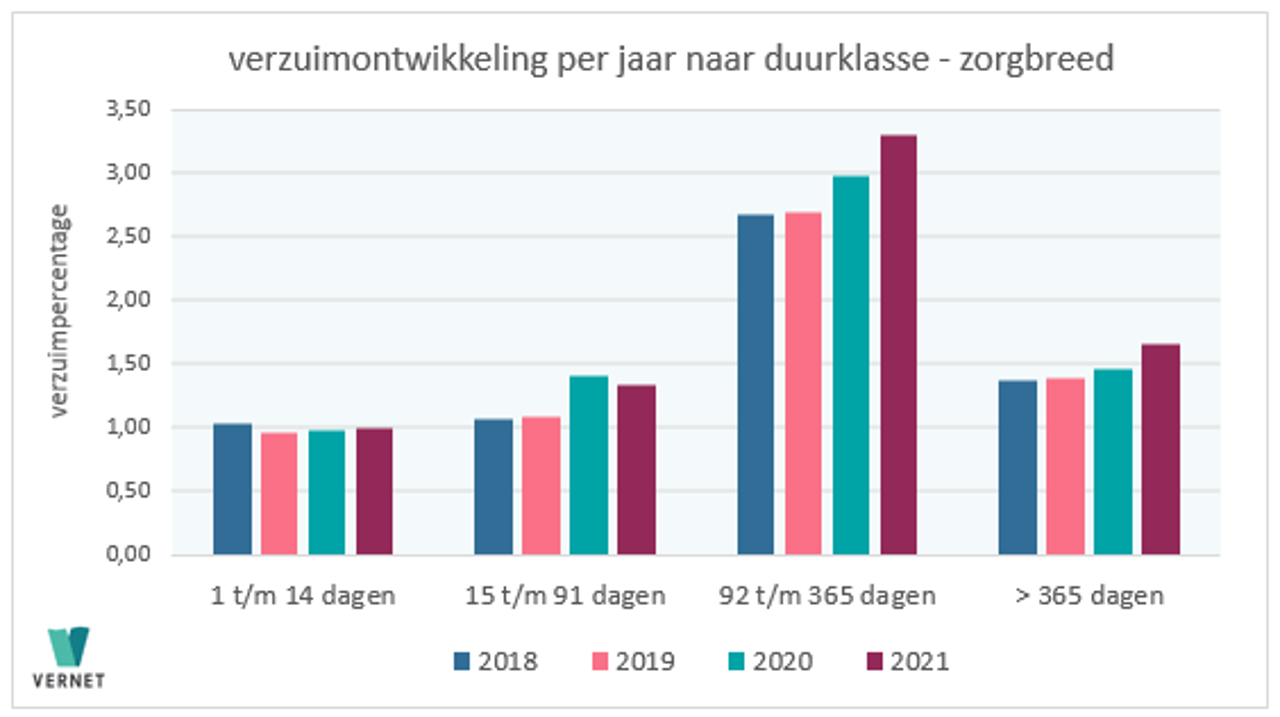 Vernet constateert dat het verzuim in alle vier de duurklassen (kort-middel-lang-extra lang) gestegen is. De stijging is het grootst in de categorie langdurig verzuim. Het percentage in de categorie 92 tot 365 dagen is 3,3. Een jaar geleden was dit nog 2,98 procent, een stijging van bijna 11 procent. De stijging in de laatste twee duurklassen is geen positieve ontwikkeling voor een sector die al kampt met structurele arbeidsmarkttekorten. Zie ook Bijlage 2.