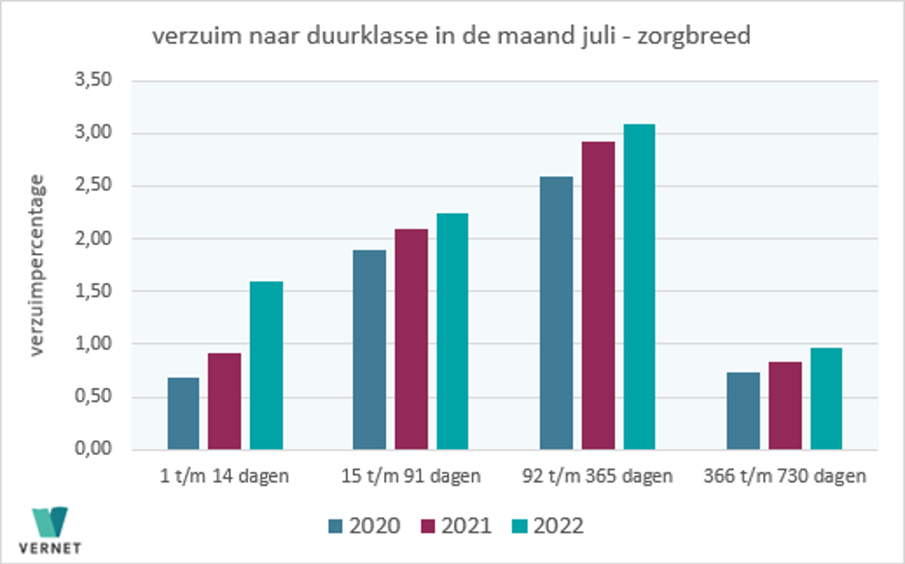 De stijging in de maand juli was het grootst in de categorie kort verzuim. Het percentage in de categorie 1 t/m 14 dagen kwam op 1,6. Een jaar geleden was dit nog 0,91 procent, een stijging van 76 procent. Een voor de hand liggende verklaring hiervoor is een opleving van het aantal Covid-besmettingen. Opnieuw was ook een stijging te zien in de laatste twee duurklassen met verzuim langer dan 92 dagen. Dit onderschrijft het beeld van een zorgsector die met veel langdurige ziektegevallen kampt. Zie ook bijlage 2.
