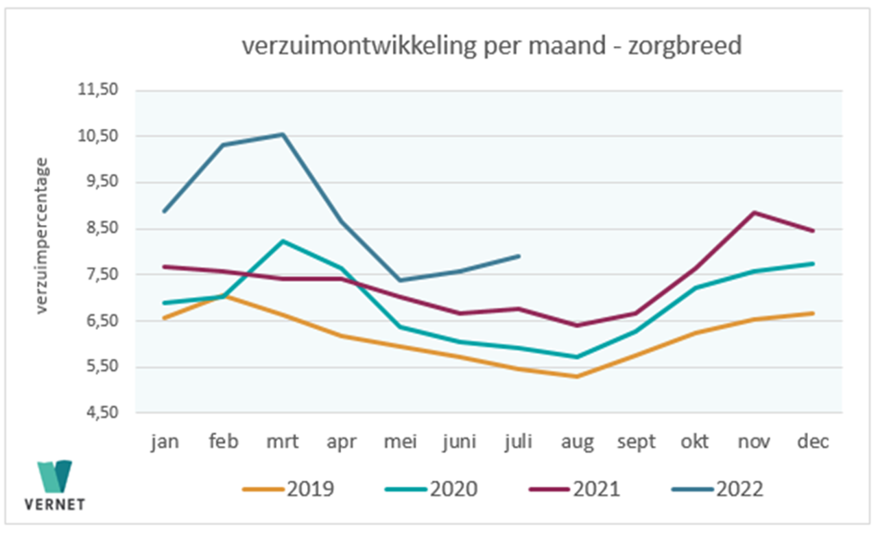 De zorgsector heeft het ziekteverzuim in juli van dit jaar sterk zien toenemen in vergelijking tot een jaar eerder. Het verzuim kwam die maand uit op 7,89 procent tegen 6,77 in juli 2021. Dat is veel hoger dan op grond van historische cijfers kon worden verwacht.