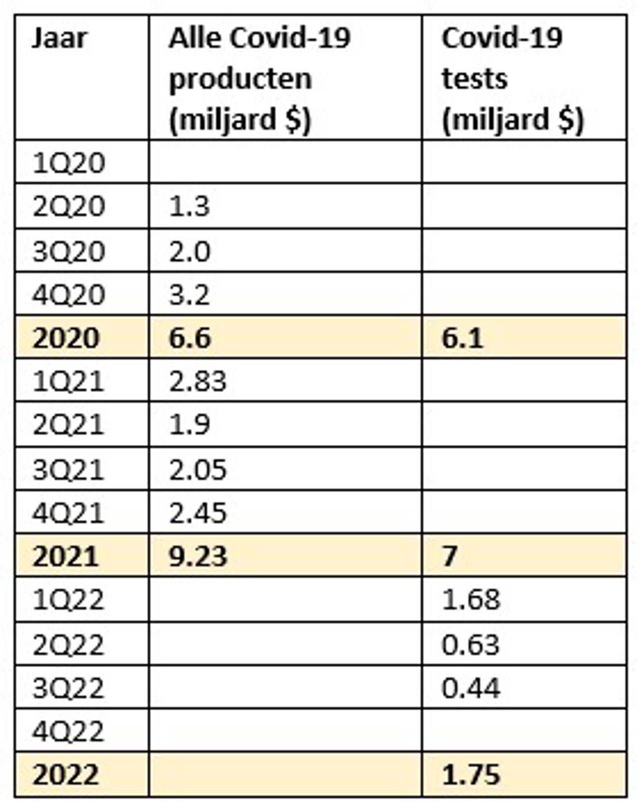 Onderstaand overzicht geeft Thermo Fisher’s Covid-19 verkoopcijfers per kwartaal, uitgerekend in US dollars weer. Het bedrijf heeft in 2022 besloten alleen nog Covid-19 testresultaten te publiceren daar waar alle andere Covid-19 gerelateerde opbrengsten, meer structureel van aard, in andere productcategorieën ondergebracht zijn.