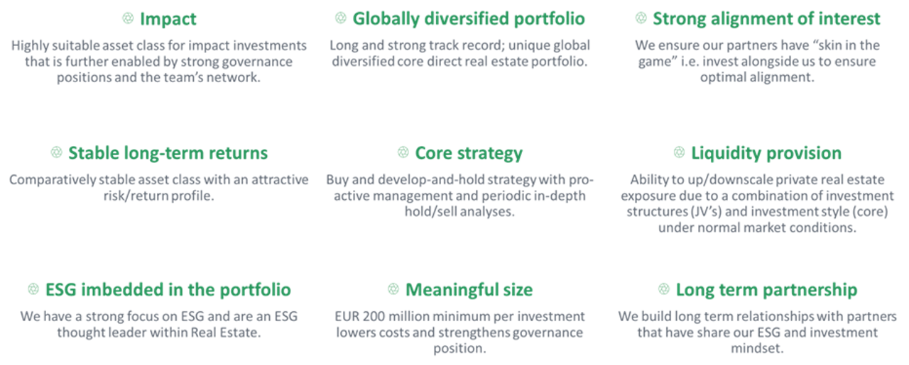Our clients’ investment objectives allow us to operate as a truly long-term investor which fits well with a long-lived asset class such as real estate. Our investment strategy combines long-term with a very hands-on involvement in the investment process. The governance position in the majority of our investments allows the team to take an active role in the investments in order to steer the changes at asset and portfolio level while taking long-term positions.