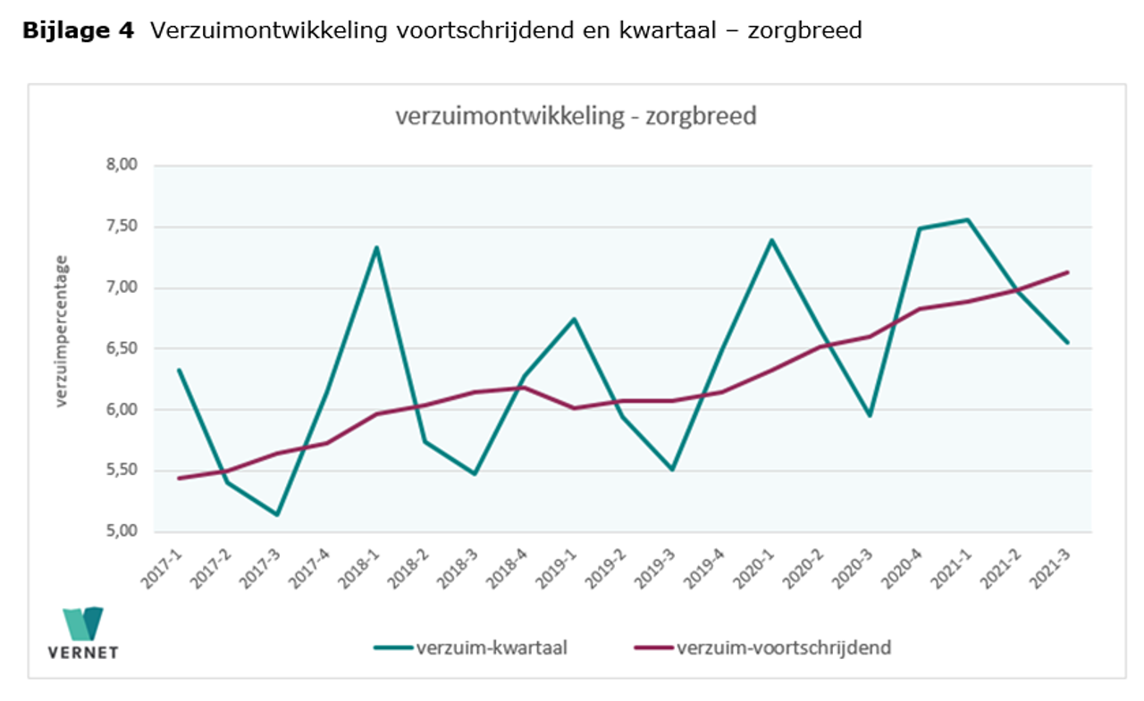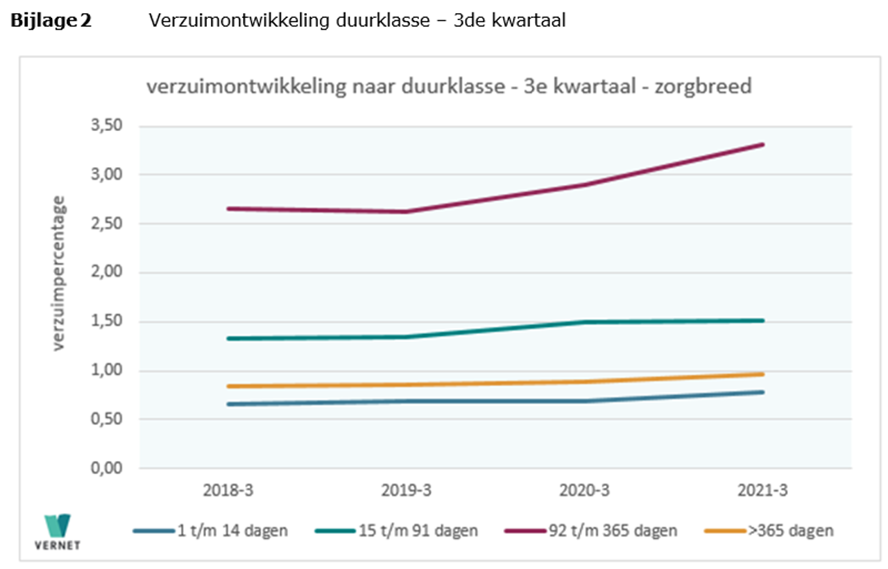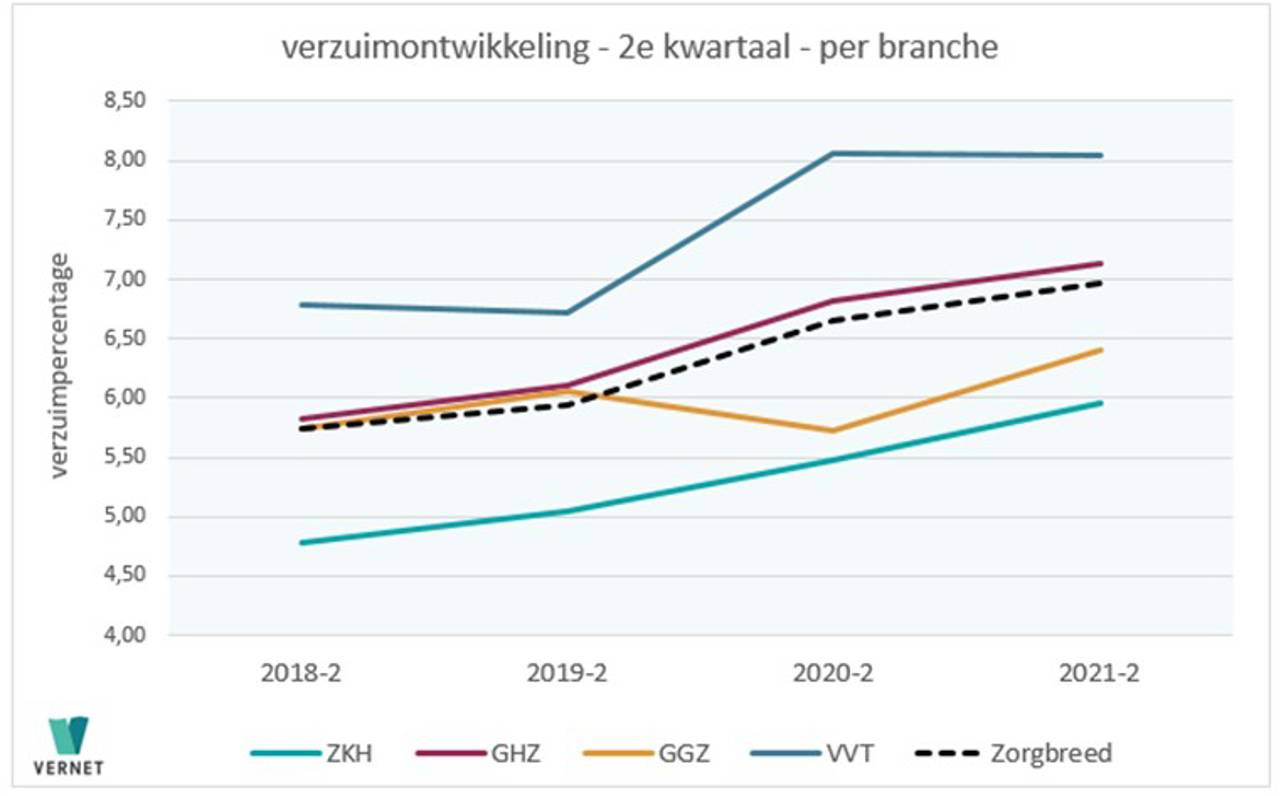 Vernet constateert dat het huidige hoge verzuimpercentage in de zorgsector met name wordt veroorzaakt door een stijging van het langdurig verzuim. Het verzuimpercentage in de categorie 92 tot 365 dagen is 3,31. Een jaar geleden was dit nog 2,9 procent, een stijging van ruim 14 procent.