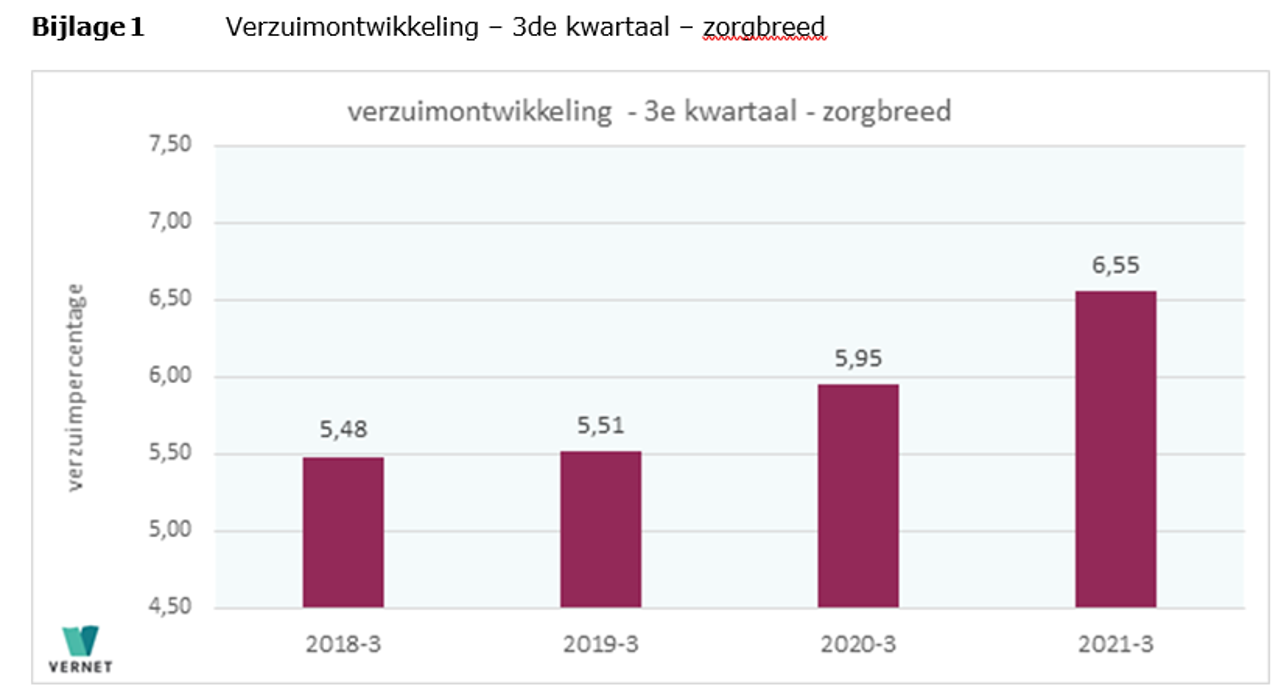 Verzuimdatabedrijf Vernet, dochteronderneming van pensioenuitvoeringsorganisatie PGGM, stelt vast dat het verzuim in de zorgsector in het derde kwartaal van 2021 is gestegen naar 6,55 procent. In hetzelfde kwartaal vorig jaar was dat 5,95 procent. Dit is een toename van 10 procent in één jaar tijd.